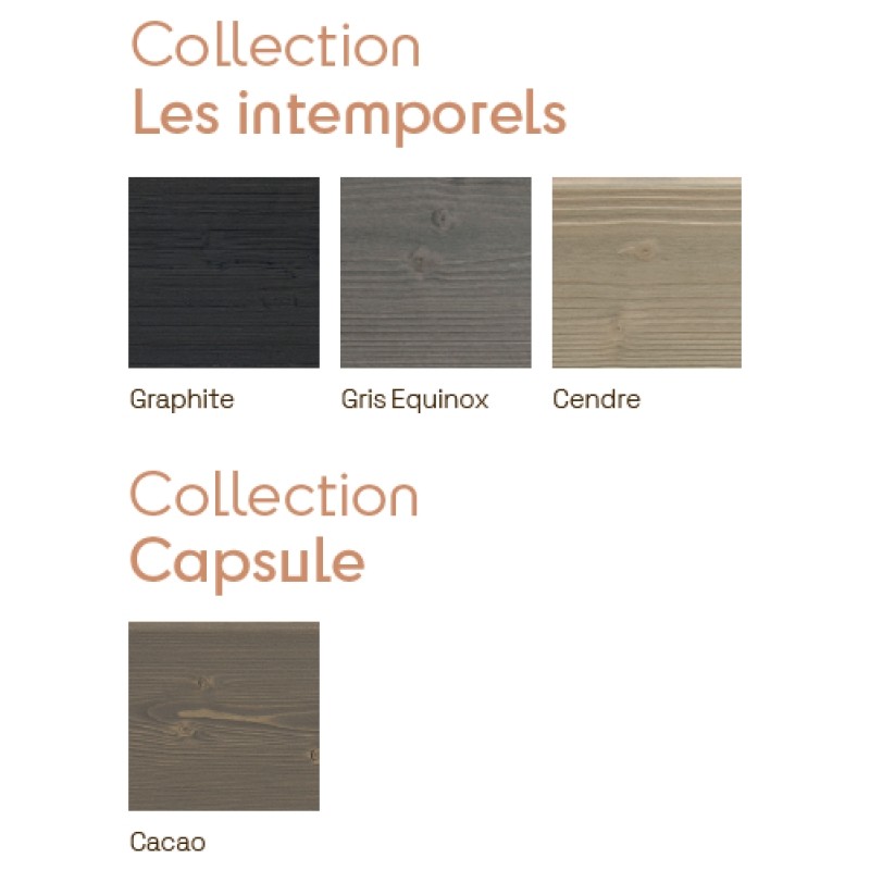 Sapin du Nord. Préservation : préservé Classe 3.1 en line flow incolore. Finition : saturateur semi-transparent. 4 coloris : Graphite, Gris Equinox, Cendre, Cacao.4 profils claire-voie : Rythmix® Onde S 40x40 mm, Rythmix® Onde M 40x40 mm, Rythmix® Dune S 40x40 mm, Rythmix® Dune M 40x40 mm. 4 profils à emboitements : Skulpt 20x125 mm, Inter'Line 20x125 mm, Swell 20x125 mm, Canyon 20x125 mm.Surface rabotée (profils claire-voie), pose en fixation apparente. Surface en usinage 3D (profils à emboitements), rainage en bout, pose en fixation cachée. Réaction au feu : F (profils claire-voie) & D-s2, d0 (profils à emboitements).Onde S & Dune S : intervalle de 30 cm. Onde M & Dune M : intervalle de 60 cm.Conseil de l'expert : Mixez les profils Rythmix® 3D entre eux ou avec le Rythmix® Carré pour des façades uniques. Conseil de l'expert : Combinez les profils Relief 3D avec le Line ou le Pulse pour une touche d'originalité. Seule la pose verticale est recommandé pour ces 4 profils.